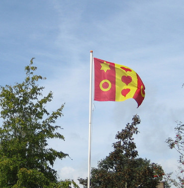 De vlag is 1 bij 1,50 meter en is kleurecht gedrukt op speciaal kunststofdoek. Een vlag kost € 40,00.